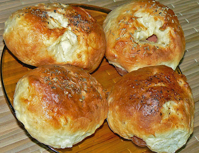 In a bowl, pour in hot milk and butter and mix. Add in salt. Add in 1 cup of bread flour into the milk mixture and combine. Add in 1 more cup of bread flour into the mixture together with the instant yeast. Combine again. Add in the rest of the flour slowly and combine thoroughly till all flour are added and a dough is formed. Dough will be slightly sticky. Just dust in more flour on the board and some onto your hands for easier kneading. Knead for 15 to 20 minutes. Put the dough into a well greased bowl and cover with a damp towel. Let proof for 30 minutes or till dough doubled in size. Then, punch dough to let air out. Pinch a half fist size ball of dough and flatten into a round shape. Place a hotdog in and take one end of the side each and bring them to the middle and overlapped. Press a little so the two ends sticks. Placed the overlapped layer downside onto the baking tray. Let them sit for another 20 minutes to rise a second time before going into the oven. Brush with a little milk and bake for 20 minutes or till it browns. I sprinkled some oregano, rosemary, paprika and crushed black pepper on top for flavour and deco. I brushed more milk in the midst of baking as not to want the top to be dry. This recipe yields about 14 mini buns. The size of half a hotdog. I had some leftovers and froze them. "B" had them for breakfast the next two days. You just have to microwave them for a couple of seconds and they'll taste just as good! Oh, the buns tasted better with a little spread of mayonaise or chili sauce.